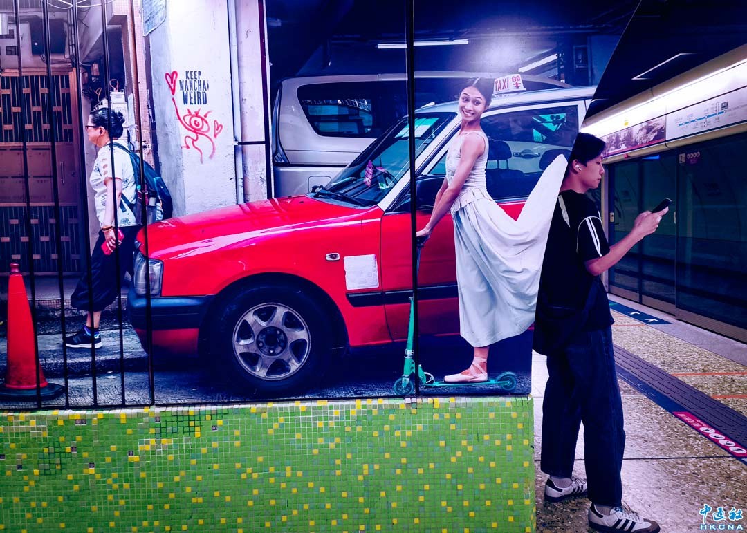 香港灣仔地鐵站的壁畫,為往來的乘客帶來視覺的享受。大型壁畫展示了香港芭蕾舞團團員與灣仔街道的互動,並記錄了日常生活中的動態。 這些作品旨在通過舞蹈和城市景象的結合,重新定義都市空間和灣仔的風情。 (香港中通社記者 洪少葵 攝)