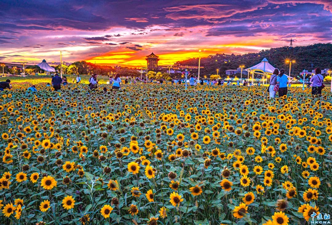 台灣台北市大佳河濱公園超過18萬株向日葵花海正盛開,花海與晚霞相輝映,醉倒不少遊人。 香港中通社圖片
