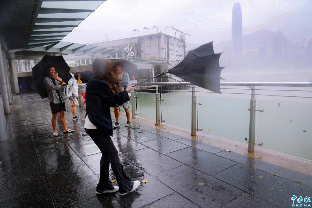 2025年9月24日,香港天文台下午1時20分改發八號風球,超強颱風“樺加沙”正逐漸遠離香港。圖為尖沙咀海傍,強風將遊客的雨傘吹翻。(香港中通社記者 徐文峰 攝)