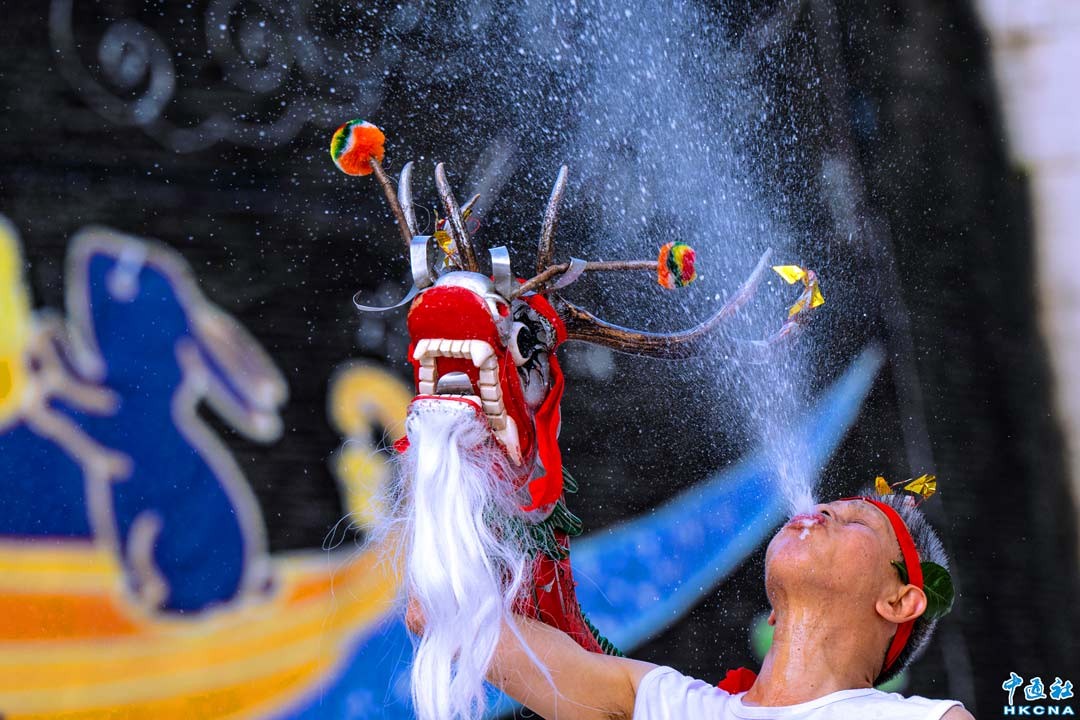 2025年10月26日,澳門東井圓佛會“慶祝新中國成立76周年、澳門特區成立26周年暨南無南屏濟公慈蓮佛聖誕817周年祈福法會及第16屆歡樂常春大巡遊”在塔石廣場舉行。圖為舞醉龍。香港中通社圖片