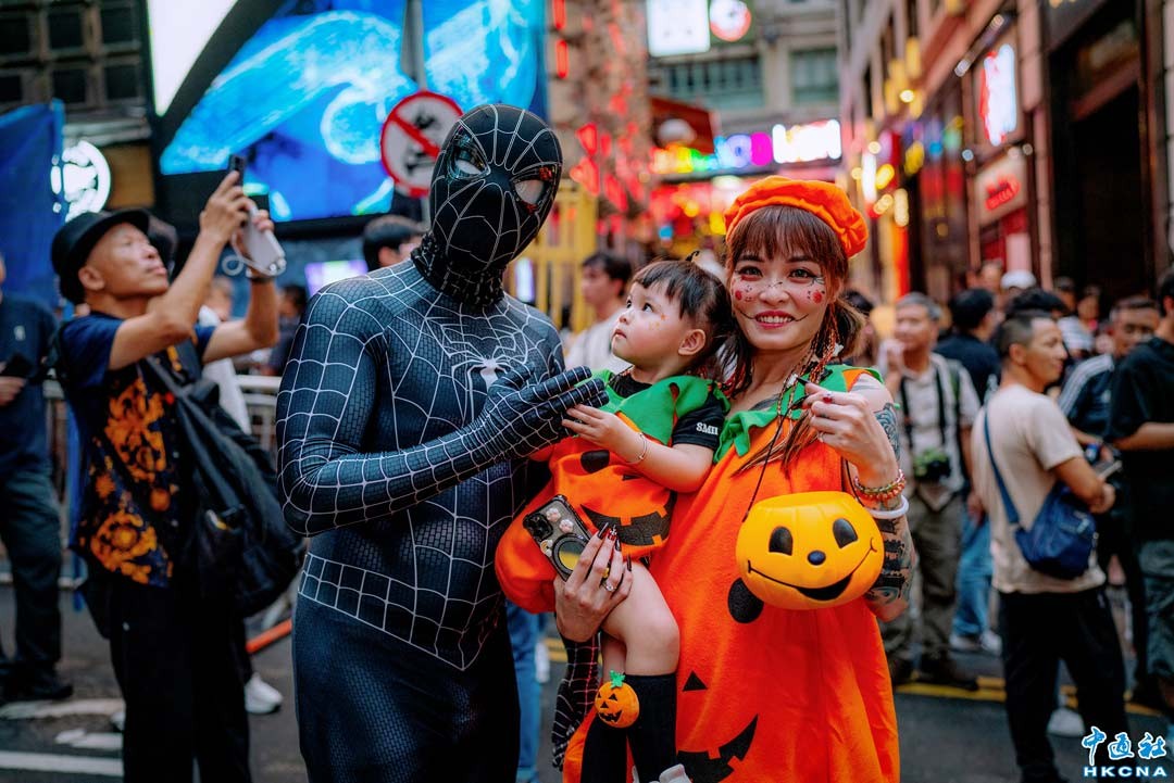 2025年10月31日晚,萬聖節正日來臨,香港中環蘭桂坊再度變身“鬼怪主場”。 夜幕降臨,蘭桂坊人流明顯增多。街巷已湧現盛裝打扮的市民與遊客,各式造型的大小“鬼怪”在人群中穿梭,拍照互動,氣氛熱烈。圖為奇裝異服的的市民在蘭桂坊慶祝萬聖節。(香港中通社記者 陳奕啟 攝)