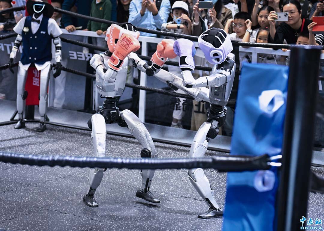 2025年11月15日,在深圳國際會展中心舉辦的第二十七屆中國國際高新技術成果交易會上,參展商宇樹人形機器人格鬥,吸引眾多參觀者圍觀。(陳文 攝)