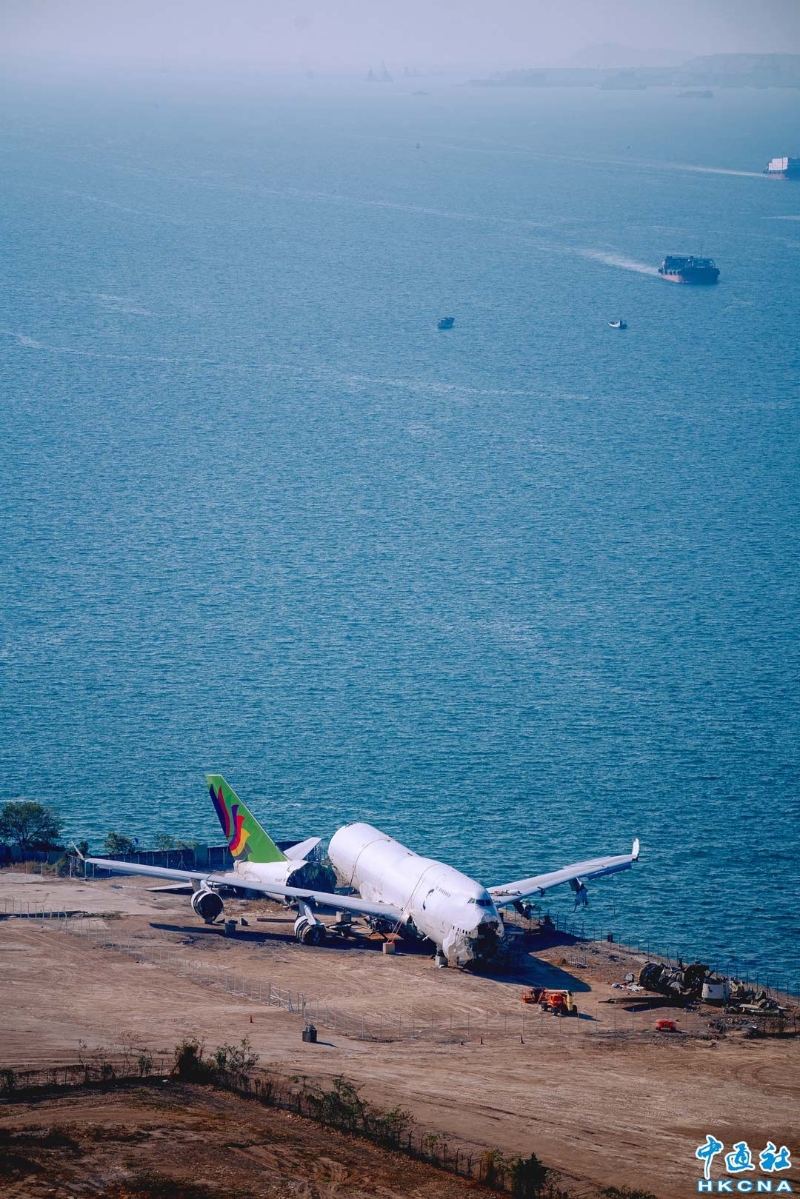 香港國際機場北跑道10月20日發生貨機事故的飛機殘骸已被成功打撈,集中安置大嶼山倒扣灣海徬。民航意外調查機構已取回“黑匣子”并正進行深入調查,初步調查報告預計在11月下旬前發表。事因一架由阿聯酋抵港的波音744貨機,10月20日凌晨在香港國際機場北跑道降落後偏離跑道,滑出海面,機上的4名機組人員獲救送院。事故中有一輛地勤巡邏車被撞入海,車上兩名工作人員死亡。(香港中通社記者 陳奕啟 攝)