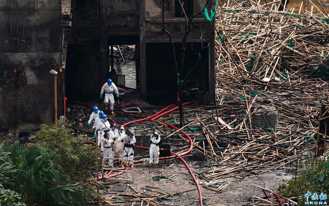 2025年12月1日,香港大埔宏福苑五級火警第六日,警方和消防繼續在現場搜證。截止當日下午4時,罹難人數增至151人,其中警方的DVIU(災難遇害者辨認組)在最先起火的宏昌閣,移出8具遺體,其中的5具為最新發現,3具為較早前發現的。(香港中通社記者 陳奕啟 攝)