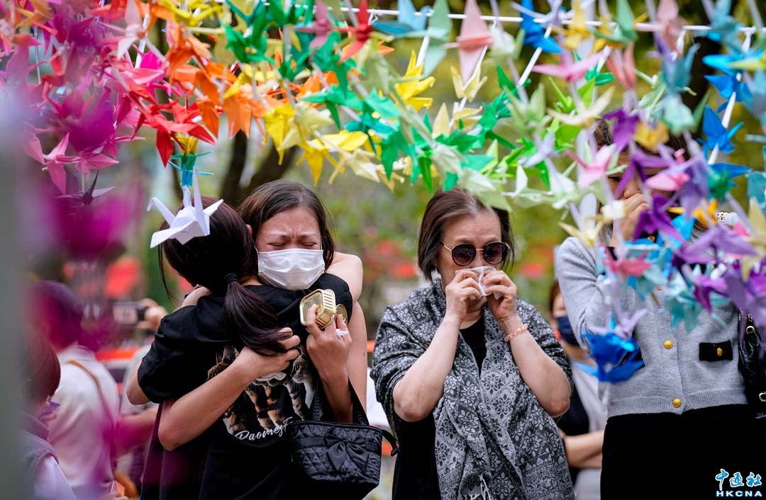 2025年12月3日,香港民眾在千紙鶴下哀悼大埔宏福苑火災逝者。(香港中通社記者 陳奕啟 攝)