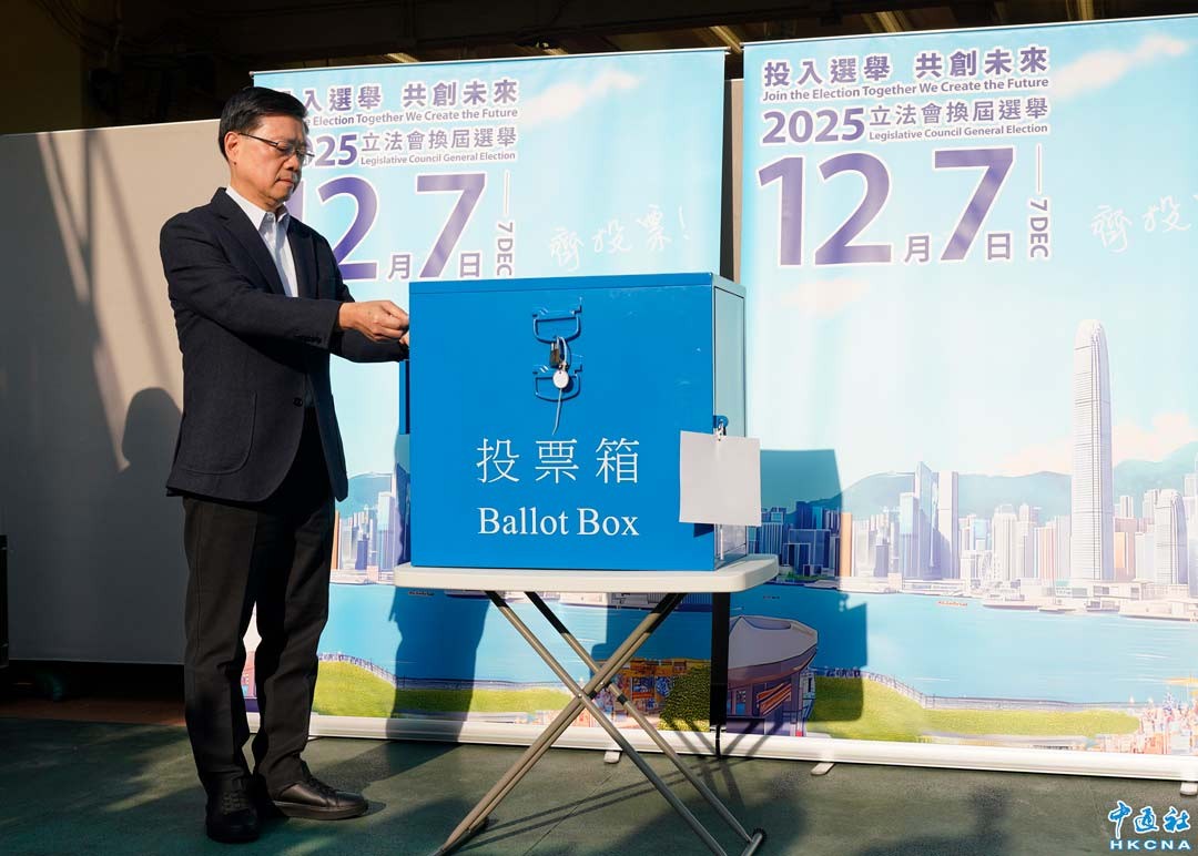 2025年12月7日,香港第八屆立法會選舉投票日。全港設600多個票站,開放予約413萬名已登記選民投票。選民將在161位候選人中投出90位新立法會議員。圖為香港行政長官李家超到高主教書院投票站投票。(香港中通社記者 陳奕啟 攝)