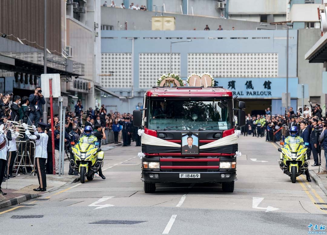 12月19日,香港消防處在九龍紅磡世界殯儀館為已故消防隊目(追授)何偉豪舉行最高榮譽喪禮。何偉豪靈柩蓋上特區區旗,抬上消防靈車。當日,香港特區行政長官李家超、多位特區政府官員出席悼念。在殯儀館外,多位特區政府官員、消防人員列隊,向何偉豪作最後致敬。(香港中通社 陳奕啟 攝)