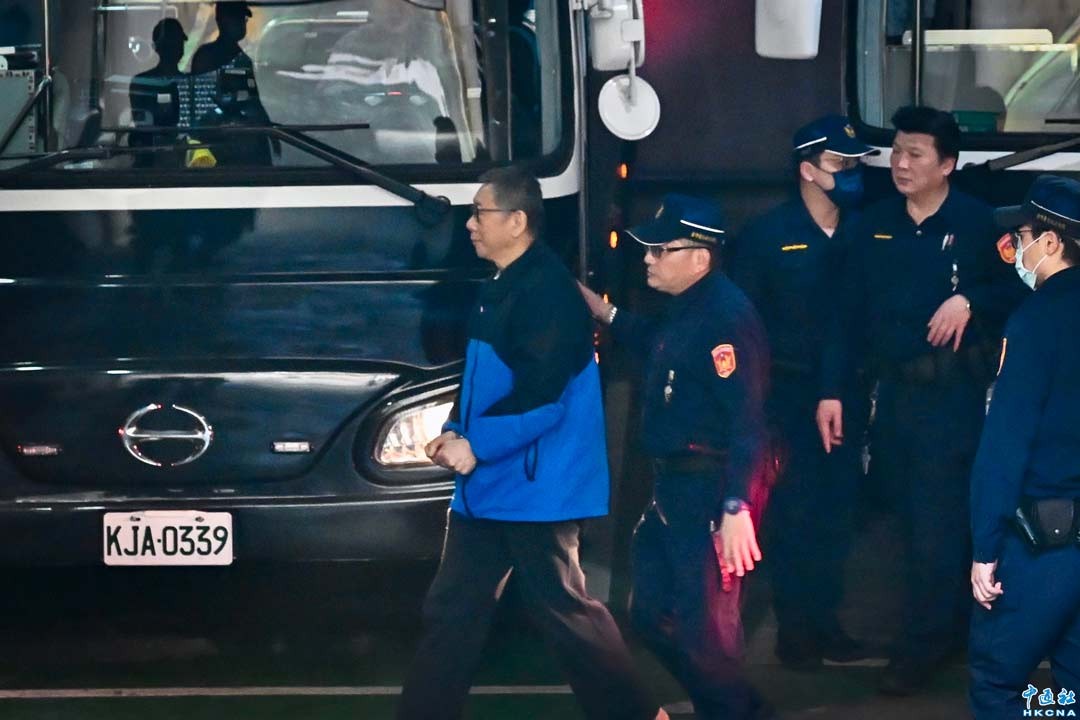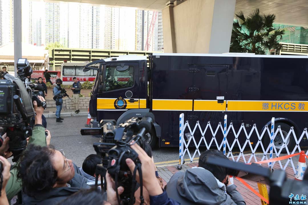 2025年12月15日,壹傳媒創辦人黎智英與《蘋果日報》3間相關公司涉嫌串謀勾結外國勢力案今早宣佈判決,三名國安法指定法官裁定黎智英兩項串謀勾結外國勢力罪及一項串謀發布煽動刊物罪成立。圖為押送黎智英的囚車駛離西九龍裁判法院,反恐特勤隊警員持槍戒備。(香港中通社記者 謝光磊 攝)