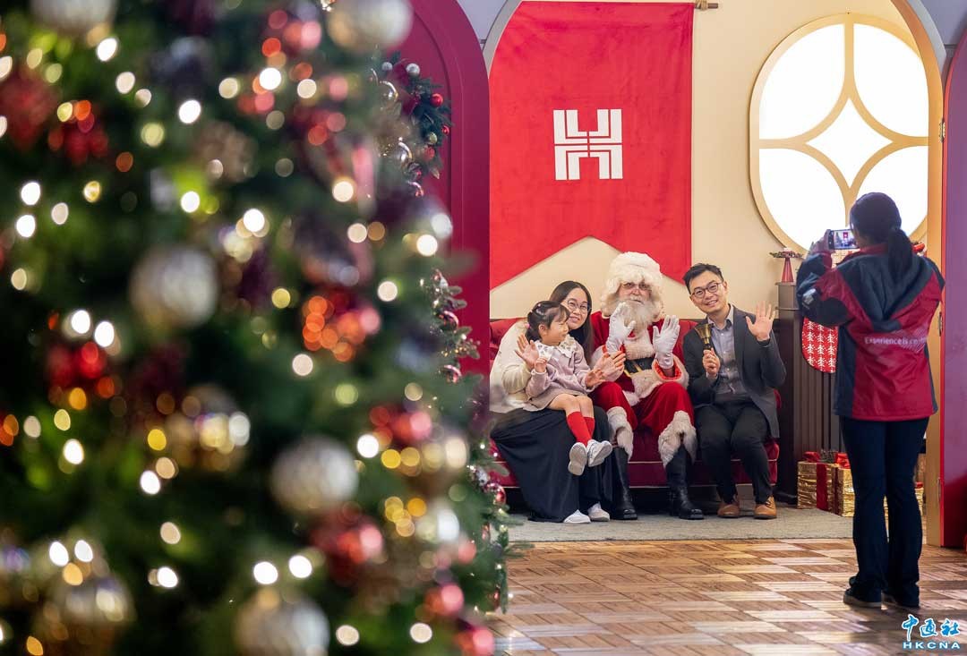 2025年12月12日,夜幕降臨,香港中環街頭亮起層層聖誕燈飾,寫字樓外的聖誕樹、行人天橋及街道兩旁的節日裝置,營造出濃厚的聖誕氣氛。市民及遊客放慢腳步,在遮打道一帶駐足觀賞,有人舉起手機拍照,有人與同伴合影留念。圖為市民與聖誕老人拍照留念。(香港中通社記者 陳奕啟 攝)