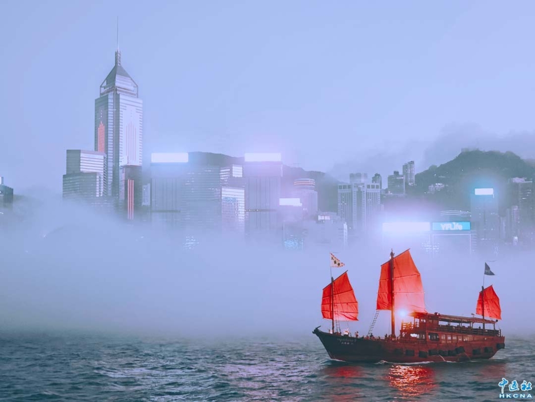 2025年3月2日,一股海洋性氣流正影響香港天氣,維港兩岸霧景迷人。香港中通社圖片