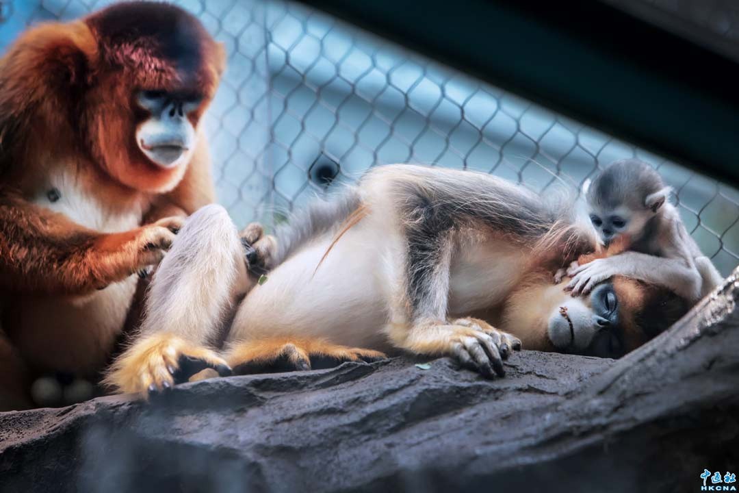 2025年1月誕生的首隻港產雌性川金絲猴,與父母一起在香港海洋公園賽馬會四川奇珍館玩耍。牠雖十分幼小,但已非常活躍,行動敏捷。(香港中通社記者 謝光磊 攝)