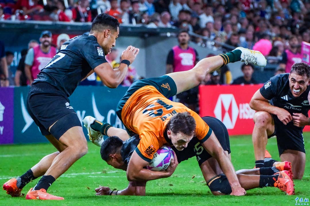 2025年3月28日,為期三天的香港國際七人橄欖球賽在啟德主場館拉開帷幕。圖為新西蘭男子隊(黑)對戰澳大利亞男子隊(黃)。(香港中通社記者 許其皓 攝)