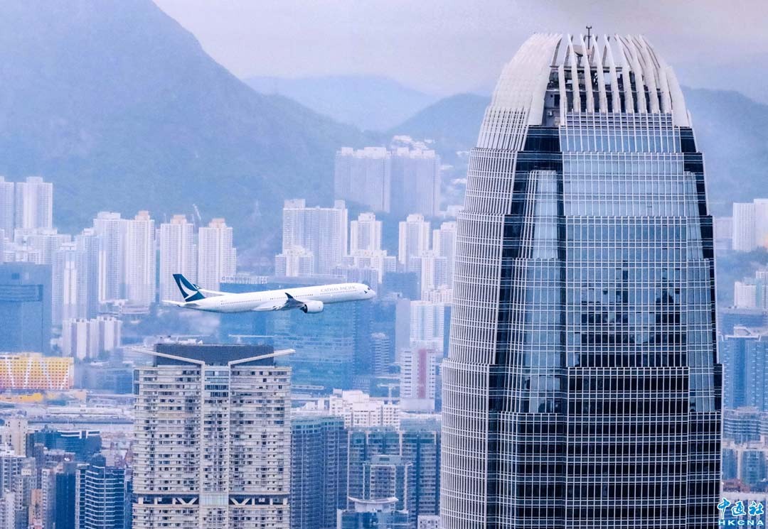 2025年3月30日下午,為紀念香港啟德機場100周年,國泰航空A350客機飛越維港,低飛到啟德體育園上空附近。當天香港市區天氣清涼,市民熱情不減。在港島太平山上一早集聚大批市民,準備一睹國泰飛機低飛的壯觀畫面。下午4時許,國泰飛機來回飛越維港,低飛環球貿易廣場118層高摩天大樓。(香港中通社記者 謝光磊 攝)