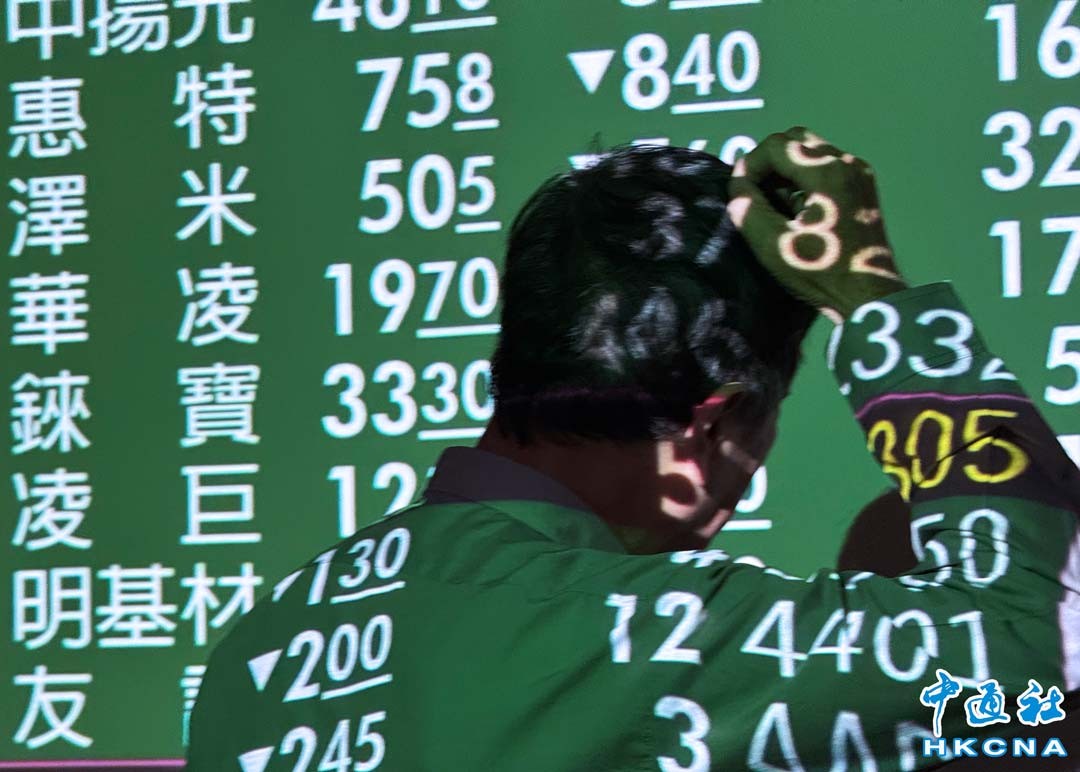 2025年4月8日,台灣股市繼續下跌,早盤以19064點開出後,盤中最低觸及18180點,暴跌逾千點,雖然尾盤略有止穩,以18459點作收,下跌772點,痛失萬九大關,跌點創史上第八大,台積電收盤816元台幣,下跌32元或3.77%。 香港中通社圖片