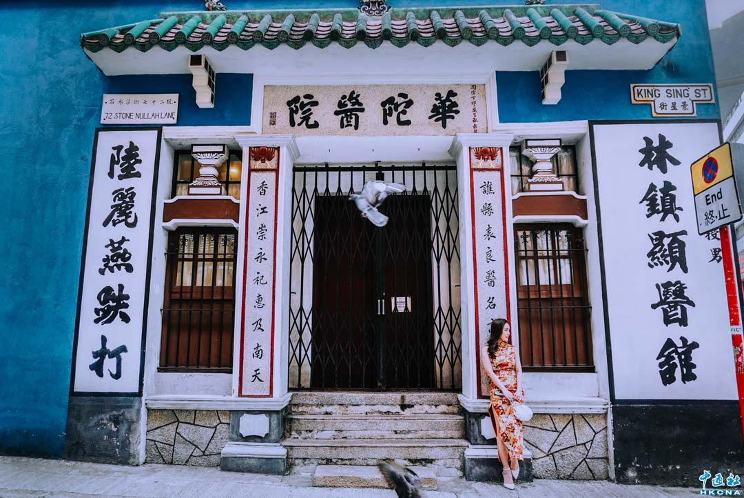 香港藍屋原址為一所“華陀醫院”,相信是首間在香港灣仔開設的華人醫院。1886年,該院關閉,於50年代改為武術學校,60年代起方為現在的針灸診所。在1978年,業權轉交政府後外牆被塗上藍色,被稱為藍屋。藍屋樓高四層,是以灰泥抹面的磚構建築物,每道邊牆均有淺山牆端,設計典雅。圖為懷舊服飾打扮的少女在藍屋建築群打卡拍照。(香港中通社記者 曹文毓 攝)