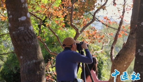 1月11日,香港迎來觀賞紅葉的最佳觀賞期,位於元朗大欖郊野公園的大棠楓香林是熱點地區之一,楓香林片片紅海,吸引不少市民及遊客特意前來觀賞遊玩,享受冬日之美。圖為有市民帶小孩拍照留念。(香港中通社記者 鄧梓傑 攝)