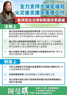 她指出,議案通過,不是劃上句號,而是重建工作的開始。第八屆立法會的首個議案辯論,突顯出“行政主導”和“愛國者治港”的制度優勢,她和一眾議員將繼續發揮監督與配合的角色,與政府、與市民風雨同路,陪伴災民走出陰霾,並以此為契機,推動系統性改革,共同建設更安全、更美好的家園。 李慧琼指,議員在發言中,除了肯定特區政府在災後迅速的跨部門應變能力,並感謝社會各界在困難時刻及時伸出援手,更聚焦如何協助災民盡早安居,期望政府做到“情、理、法”兼備,審慎考慮居民聲音,在安置方案上讓居民“有得揀”。來自不同界別的議員亦發揮所長,從金融紓困、保險理賠和法律權益,到建築工程安全、大廈管理問題、情緒支援等範疇,提出了專業見解,盡力建言獻策,充分體現了本屆立法會“急民所急”。 她說政務司司長總結發言時,承諾會認真考慮議員的意見,並會繼續就改革方案諮詢立法會。她和議員均期望,政府在綜合和仔細分析災民、議員及社會各界的意見後,盡快敲定對災民最有利的長遠安置方案。 (完) 【編輯:張明臻】