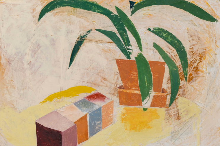 譚坦作品《蠟燭、花盆和書架》,布⾯油畫,60 x 90 cm,2025。(明畫廊供圖)