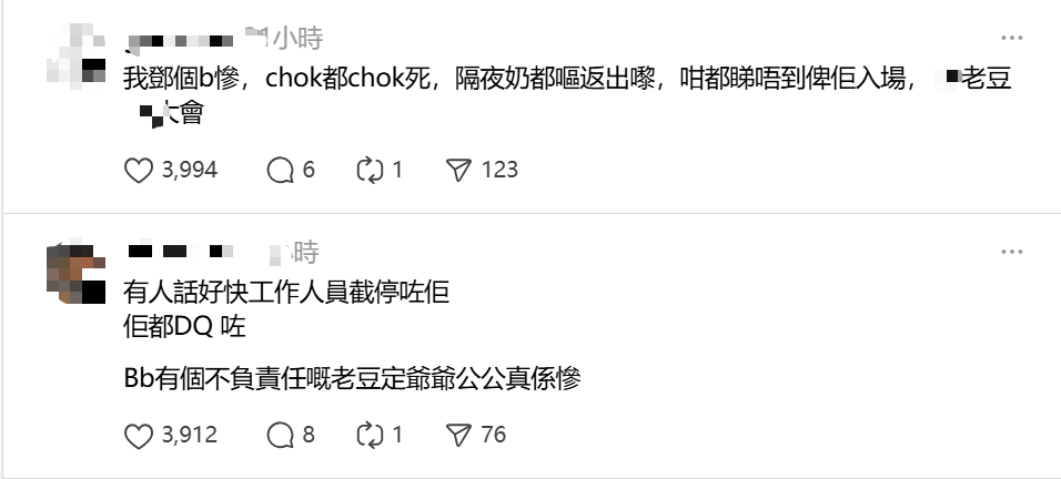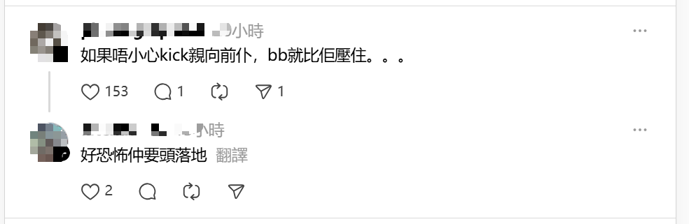 社交媒體Threads截圖 有網民分析,這樣容易讓孩子腦震蕩;也有有人質疑該參賽者為何沒有另一半或親朋好友幫忙照護小孩。也有網民表示:“如果唔小心kick親向前仆,bb就比佢壓住。(如果不慎往前摔倒,嬰兒就會被壓住)”“好恐怖仲要頭落地”“其實咁樣應該已經可以告佢虐待兒童。”