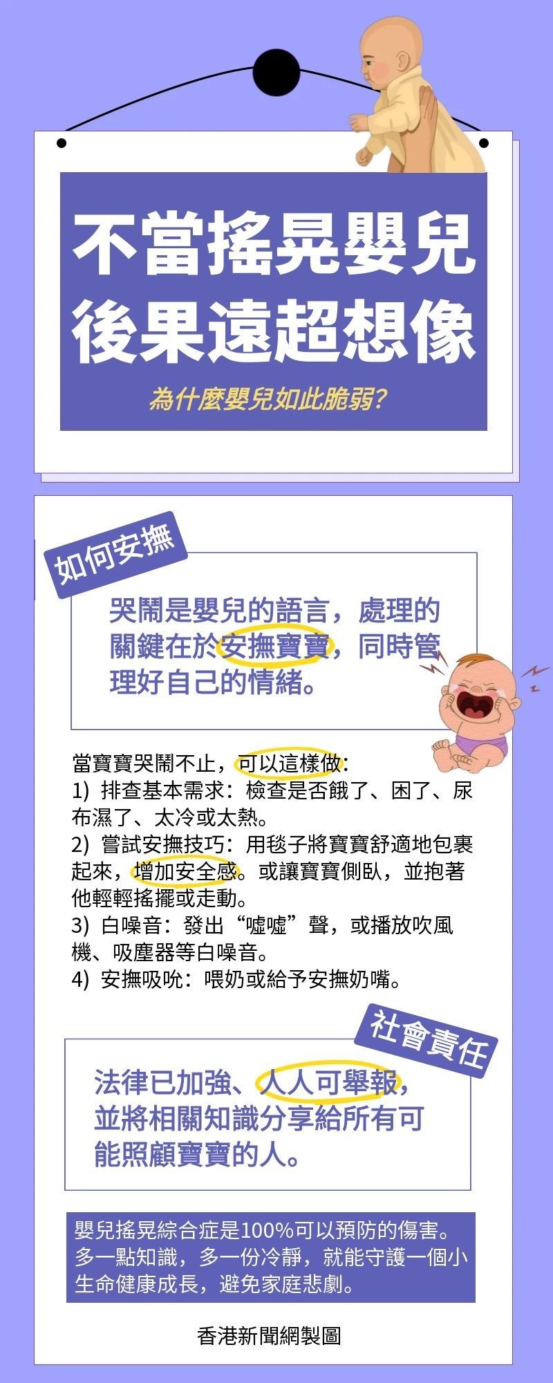 香港新聞網1月22日電 看似無關的賽場與家庭,潛藏著同一致命風險。近期兩起牽動香港社會的事件,共同揭示了不當搖晃對嬰兒造成的嚴重威脅。賽場上,近日渣打香港馬拉松賽事期間,有一名男子胸前孭着嬰兒參賽;家庭中,四個月大男嬰疑遭搖晃叉頸致腦出血。這兩起性質不同的事件,指向同一個被廣泛忽視的育兒常識:嬰兒頭部劇烈搖晃,可能瞬間造成不可逆的終身傷害。 前者或許源於對風險的認知盲點,後者則涉嫌故意虐待。無論起因如何,後果同樣沉重。這份懶人包清晰說明“嬰兒搖晃綜合症”的風險、識別方法與正確安撫技巧,守護每個脆弱的小生命。