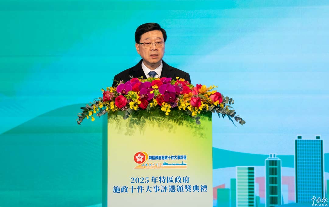 1月29日,“2025年特區政府施政十件大事評選”頒獎典禮在香港會展中心舉行。“立法會選舉成功舉行 優質民主開創新局”位列特區政府施政十件大事首位,“宏福苑發生五級大火 齊心協力救災善後”踞次席。圖為香港特區行政長官李家超致辭。(香港中通社記者 陳奕啟 攝)