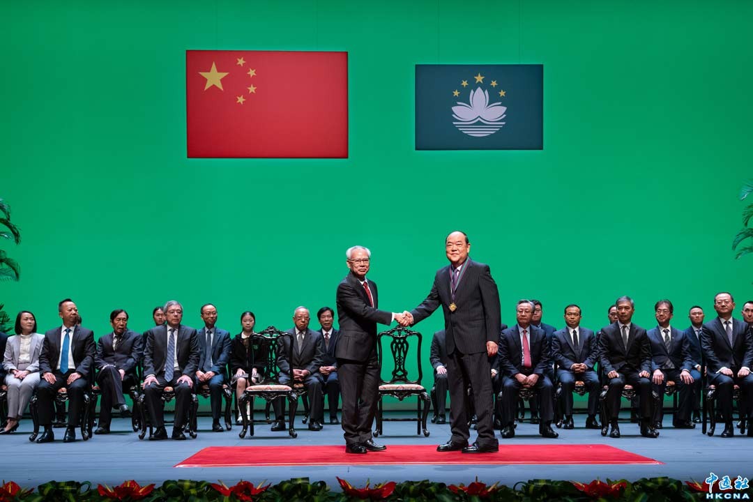 1月30日,澳門行政長官岑浩輝(左)向賀一誠頒發大蓮花榮譽勳章。當日,澳門2025年度授勳儀式在文化中心舉行,澳門行政長官岑浩輝向28名個人或實體頒授勳章、獎章和獎狀,表揚他們在個人成就、社會貢獻或服務澳門的傑出表現。 香港中通社圖片