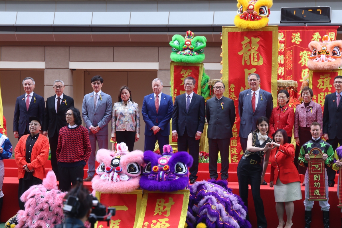 香港新聞網2月19日電,(記者 鄧梓傑 ) 2月19日(農曆大年初三),香港賽馬會在沙田馬場舉辦“馬年賽馬日”活動。當日上午,馬匹亮相圈上演新春綜合匯演,香港歌手陳慧琳化身“財運吉星”以歌聲送上新春祝福。人氣組合農夫FAMA與香港堪輿學家麥玲玲現場演繹經典歌曲《風生水起》,又送上馬年祝福及開運貼士。 現場更安排醒獅獻瑞、財神賀歲,連同一眾騎師向觀眾送上新春吉祥祝福,齊齊“財來運起”。特區政府財政司司長陳茂波、文化體育及旅遊局局長羅淑佩亦到場與一眾市民現場拜年。 全天共有11場賽事,第一場中午12時半開跑,重頭戲是第六場、1600米的“馬年盃”圖為市民與財神打扮工作人員合影。