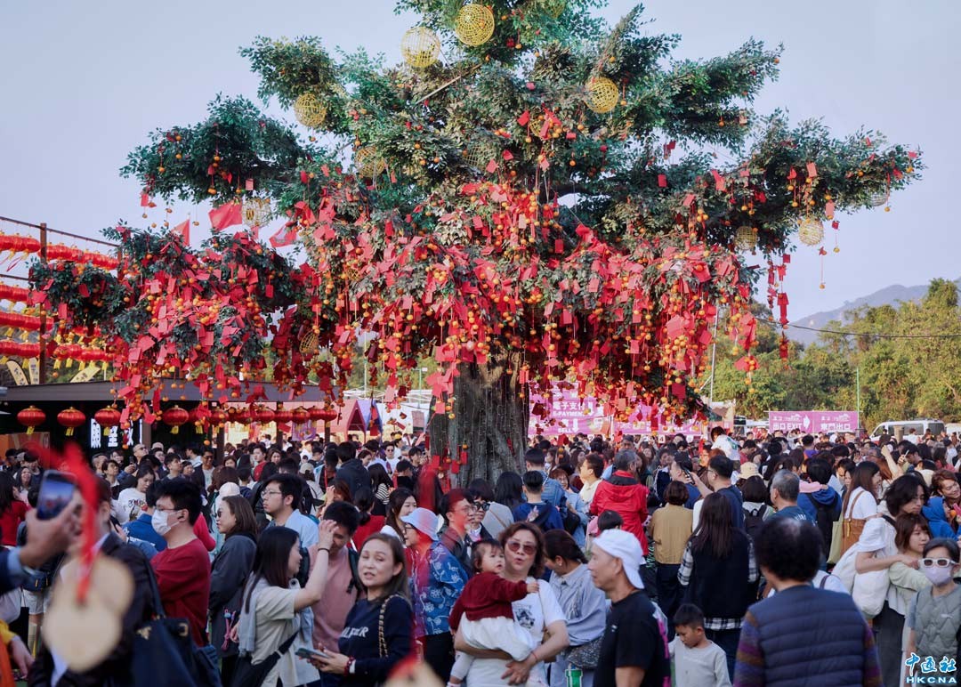 2月18日(農歷大年初二),香港大埔林村許願樹迎來大批市民與遊客,人們通過拋寶牒、掛心願卡等傳統習俗祈福新年。現場人氣旺盛,許願樹掛滿紅色寶牒,與周邊燈籠裝飾交織出濃厚年節氛圍。圖為林村許願樹吸引大批市民遊客來訪。(香港中通社記者 鄧梓傑 攝)