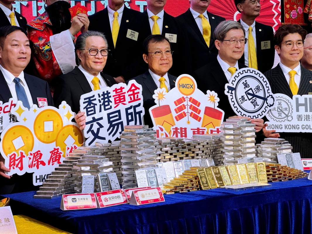 2月20日,香港黃金交易所舉行新春開市儀式,展示近一噸重的黃金與白銀,現貨價值達2億元。上午9時金價開市,本港九九金以每兩46,518元開盤,較前一交易日上漲93元。(香港中通社記者 朱樂怡 攝)