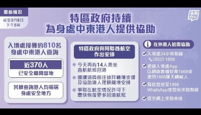 至於其餘人士,入境處已就其行程及航班資訊提供適切意見,並向身處阿聯酋和卡塔爾的人士表示可以協助安排機位返港。 特區政府指出,就中東往返香港的航班情況,除阿聯酋航空繼續每日安排一班直航客機由迪拜返港,得悉卡塔爾航空將於明天安排一班直航客機由多哈返港。特區政府已即時聯絡仍身處當地查詢港人,並通過中國駐卡塔爾大使館及卡塔爾駐香港總領事館了解最新情況,及與卡塔爾航空協調安排有特別需要的港人乘搭該航班盡快返港。(完) 【編輯:張明臻】