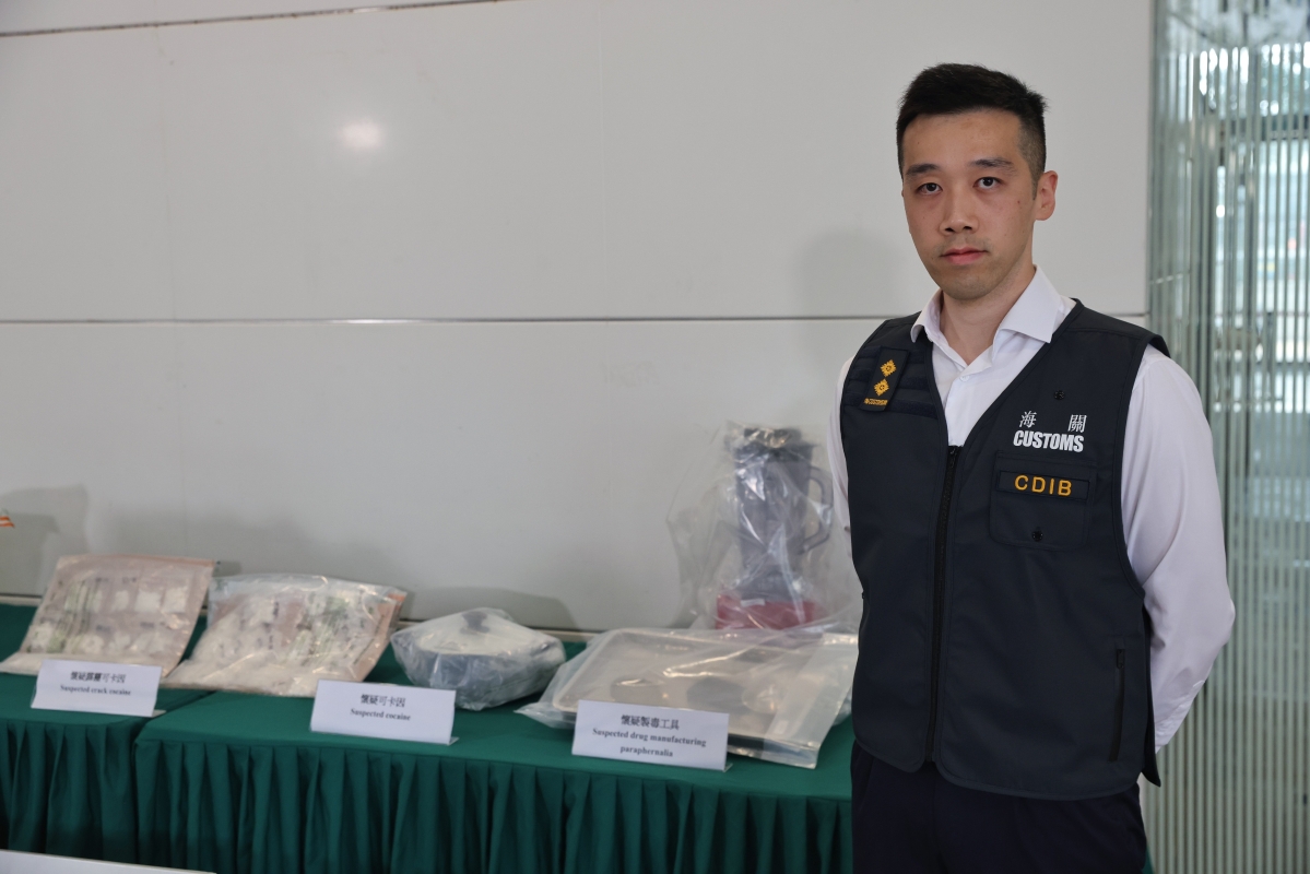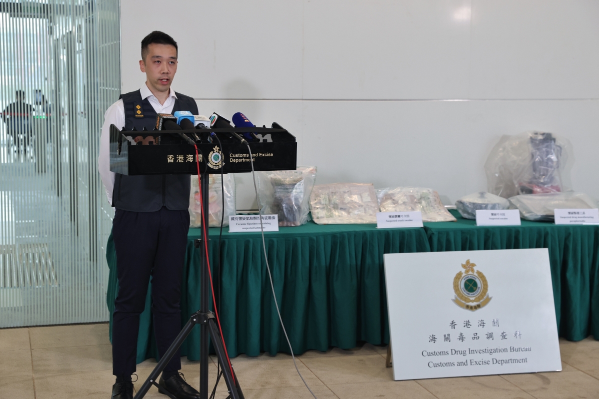 圖為香港海關毒品調查科毒品調查第一組調查主任陳達川舉行記者會。