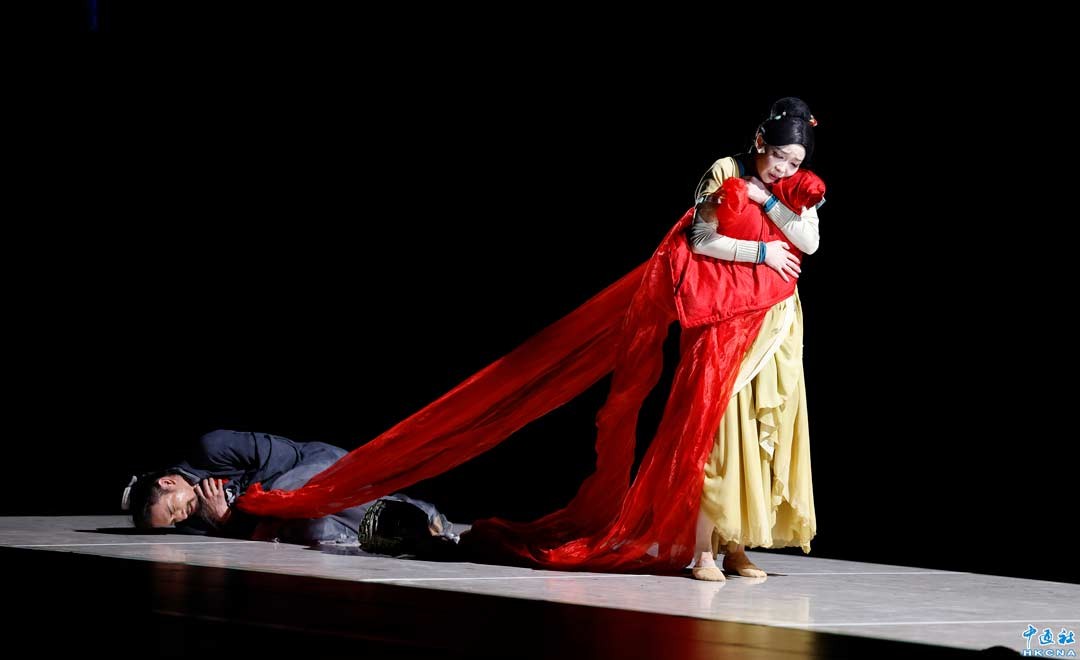 3月27日,“國風國韵飄香江”之舞劇《趙氏孤兒》登陸香港西九文化區戲曲中心大劇院。為香港觀眾獻上一場跨越古今的文化盛宴。圖為舞劇《趙氏孤兒》演出劇照。(香港中通社記者 陳奕啟 攝)