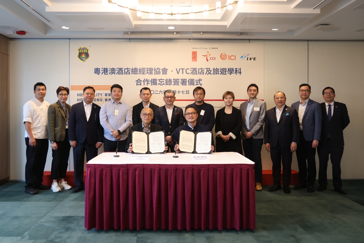 香港新聞網4月17日電(記者 鄧梓傑 )4月17日,香港粵港澳酒店總經理協會與職業訓練局(VTC)在香港廚藝學院舉行合作備忘錄簽署儀式。雙方就課程協作、實習就業、行業推廣等方面深化合作,共同推動酒店及旅遊行業人才培養。同時亦將合作舉辦行業展覽、推進“職專畢業生留港計劃”(VPAS)聯合招生,並為VTC學生提供實習與就業崗位,助力香港旅遊產業長遠發展。簽署儀式後,嘉賓一行參觀了國際廚藝學院的培訓廚房、廚藝工作室等教學設施,實地瞭解VTC在餐飲及酒店管理領域的教學資源。