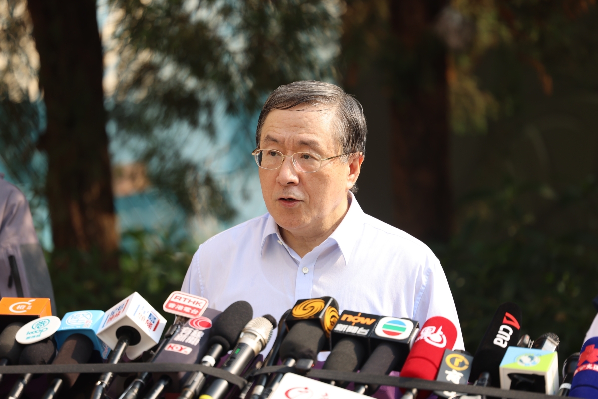 香港特區政務司副司長卓永興、保安局局長鄧炳強、房屋局局長何永賢、民政及青年事務局局長麥美娟和勞工及福利局局長孫玉菡早上視察上樓安排的準備情況後,在大埔浸會公立學校會見傳媒。