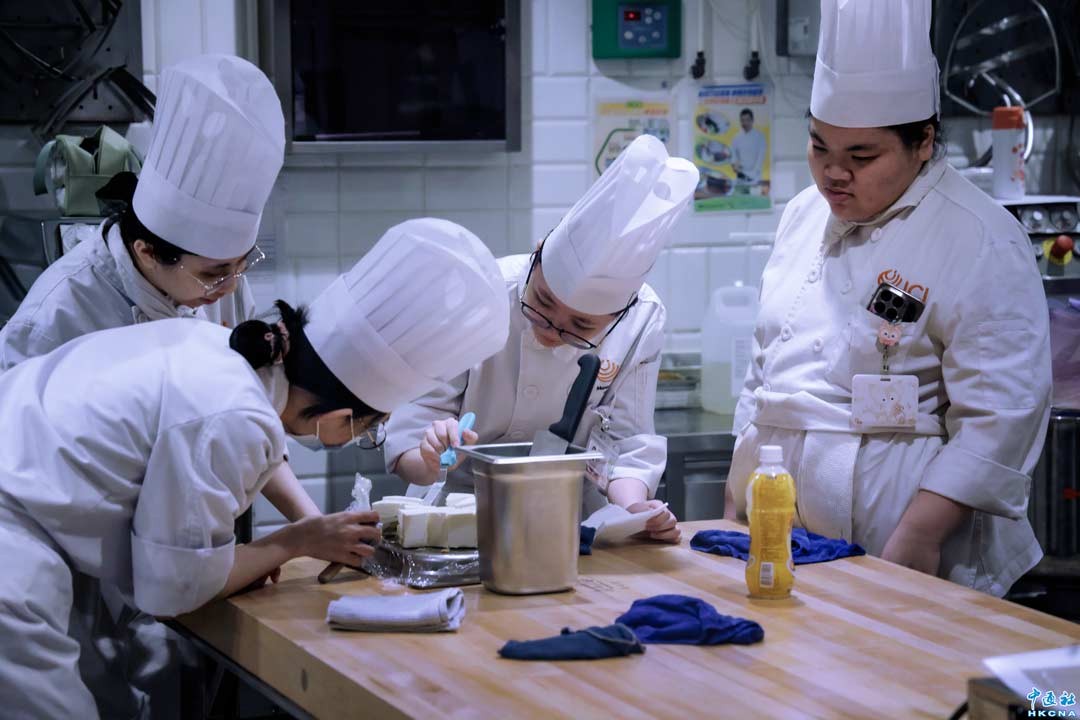 4月17日,粵港澳酒店總經理協會(GHM)與職業訓練局(VTC)在香港國際廚藝學院舉行簽署“職業專業人才入學計劃”(VPAS)合作諒解備忘錄儀式,雙方將在職業專才教育及行業協作領域推動更深層次的合作。儀式結束後,參會嘉賓參觀了國際廚藝學院的示範廚房、廚藝工作室及酒店客房模擬實訓區。圖為學生在學習甜點製作。(香港中通社記者 鄧梓傑 攝)