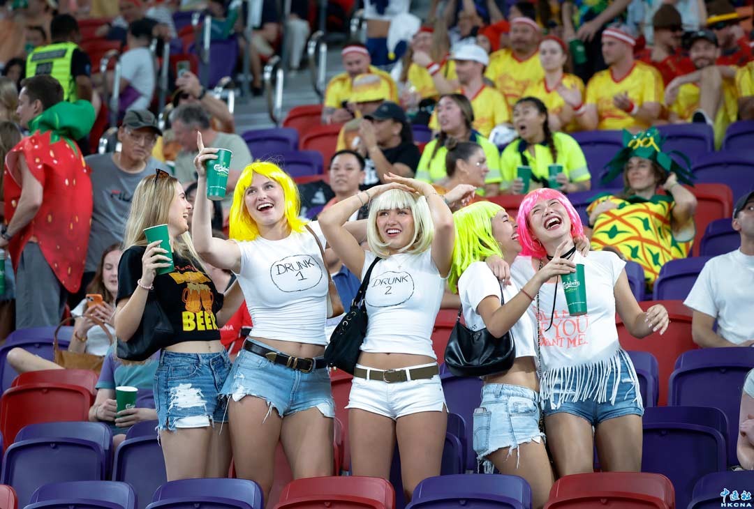 4月17日,為期三天的2026香港國際七人欖球賽在啟德體育園開鑼,來自世界各地的30支隊伍帶來72場精彩賽事。圖為現場看球興奮的球迷。(香港中通社記者 陳奕啟 攝)