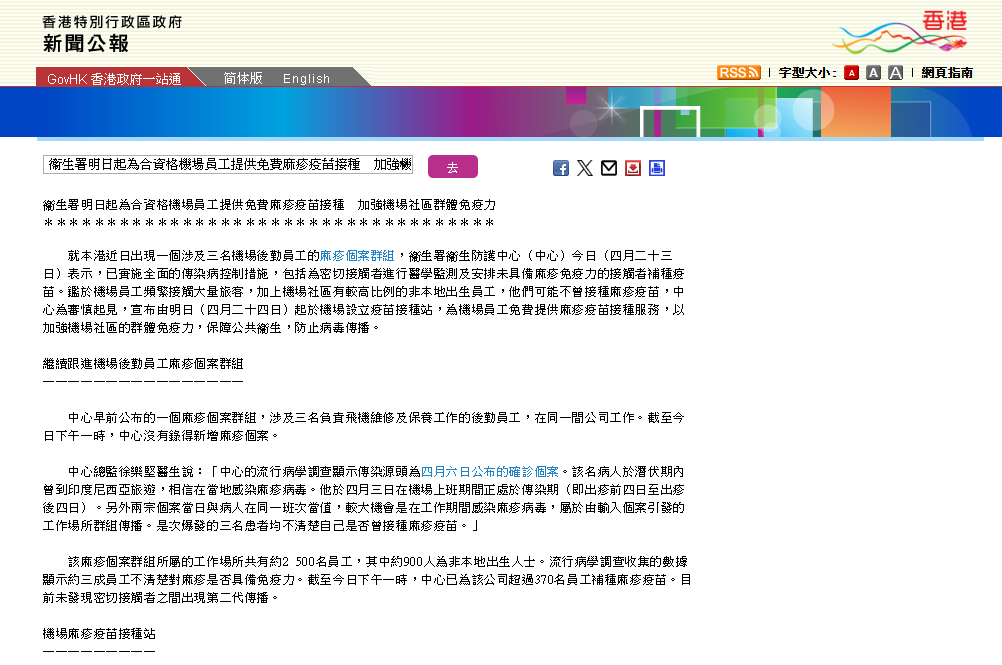 香港新聞網4月23日電 就香港近日出現一個涉及三名機場後勤員工的麻疹個案群組,衞生署衞生防護中心23日表示,已實施全面的傳染病控制措施,包括為密切接觸者進行醫學監測及安排未具備麻疹免疫力的接觸者補種疫苗。