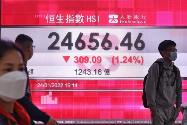 香港中通社1月24日電 在美國十年期債息上升和美股六連跌下,港股24日回吐逾300點,收報24656點,三大指數齊跌。