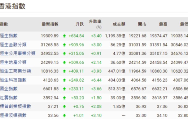 科網股造好,小米集團升0.6%,騰訊控股升1%,京東集團升2%,美團升2.5%,阿里巴巴升4.8%。