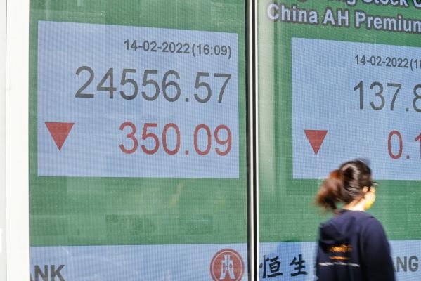 香港中通社2月14日電 香港股市上周累升333點後,14日受美股急挫影響,表現明顯反覆。恆生指數當天收跌350點或1.41%,收報24556點,連跌兩個交易日,成交額1138.38億港元。 當日,恆生指數先低開181點或0.7%,報24725點,其後輕微升至24733點,但在買盤薄弱下,大市再進一步受壓。午後港股跌幅收窄,大部分時間維持逾300點跌幅。