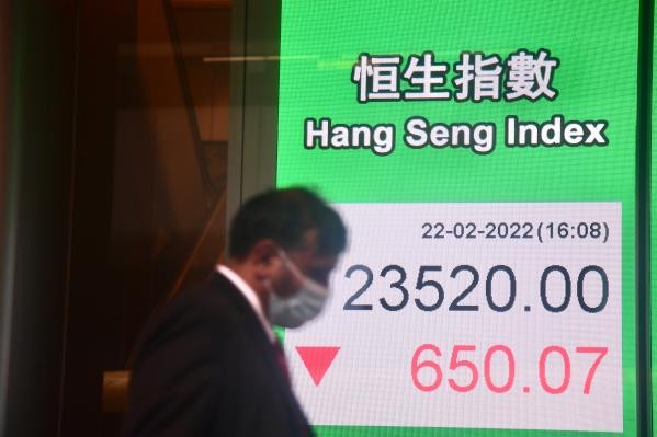 香港中通社2月22日電 俄烏關係緊張,經過兩日急跌的香港股市22日再顯著下挫。恆生指數當天收報23520點,跌650點或2.69%,連跌3個交易日。 當日,港股低開477點,開市已跌穿50天線(約23921點),其後跌幅一度擴大至逾800點;下午開市後繼續向下,尾市仍捱沽。大市成交額1469.28億港元。