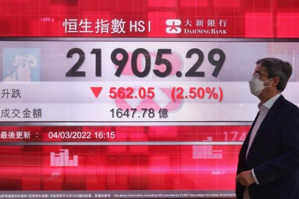 香港中通社3月4日電 俄烏緊張局勢進一步升級,資本市場恐慌情緒影響港股顯著下挫。恒指4日收市報21905點,跌562點,跌幅2.5%,失守22000點,創近兩年低位。主板成交顯著增加達1648億元。恒指本周累跌3.8%。