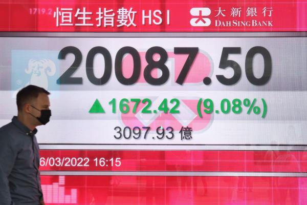 香港中通社3月16日電 香港股市結束三日跌勢,重上兩萬點;恒生指數16日收市報20087點,升1672點或9.1%;大市全日成交急增至3097.93億港元。