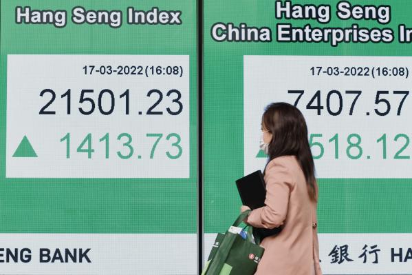 香港中通社3月17日電 港股兩日飆升3086點或16.8%,重上十天線。17日收市恆生指數升1413點或7%,報21501點;大市成交3009.59億港元,連續兩日成交額超三千億港元。
