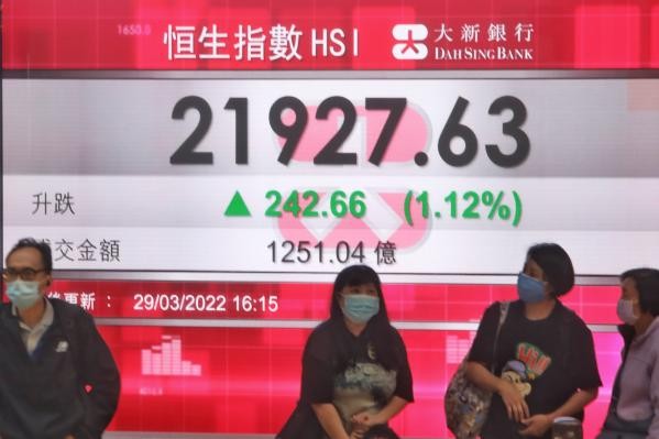 香港中通社3月29日電 香港股市29日反覆勢好,恆生指數收市報21927點,升242點或1.12%,連升兩個交易日,累漲522點。 當日,恆生指數早市先輕微高開86點至21771點,其後一直處於整固之中。午後港股反覆向好,收市逼近高位。大市成交額為1251.04億港元,為3月3日以來最低。