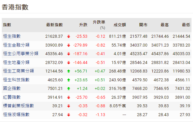 香港新聞網6月7日電 港股6日急升後7日走勢反覆,恒生指數半日跌25點,報21628點,大市半日成交811億港元。