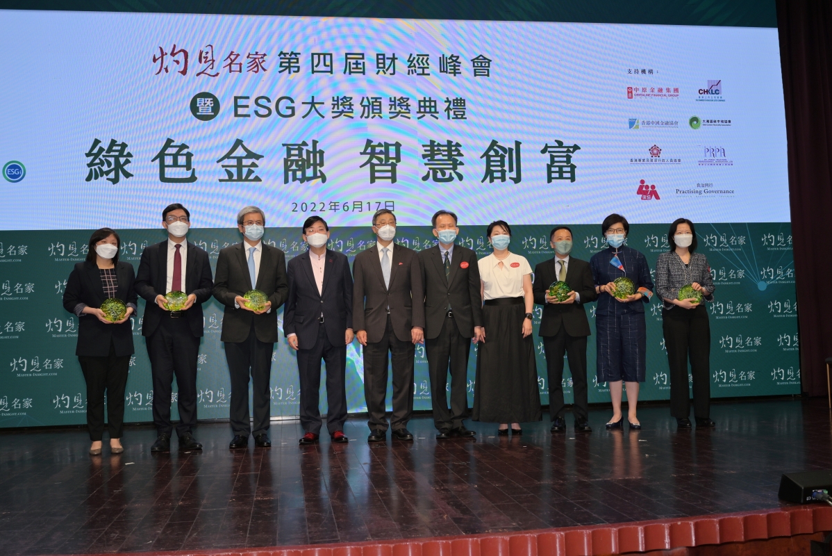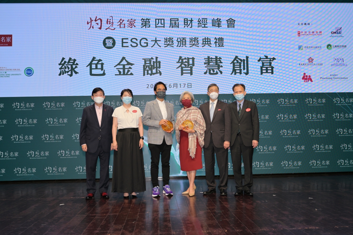 ESG翹楚大獎分別由楊敏德(右三)及鄭志剛(右四)奪得。香港恒生大學校長何順文教授(左一)及灼見名家傳媒董事會主席潘燊昌(右二)頒發獎項。右一為灼見名家傳媒社長文灼非,左二是灼見名家營運總監黃小華。