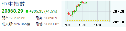 當日,港股高開113點,開報20676點。開市後曾升近200點,其後表現反覆,升幅曾收窄至百點內,之後再次擴大至逾300點水平。