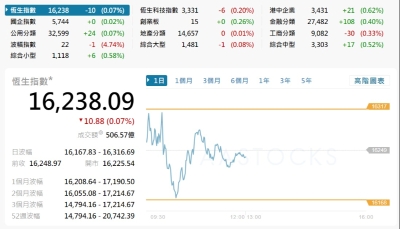 香港新聞網8月8日電 恆生指數8月8日半日收報20050點,跌151點或0.75%,大市成交額為416.77億港元。