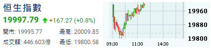 當日,港股高開165點,開報19995點,早段升幅收窄,並一度轉跌,其後大市升幅擴大至140點。